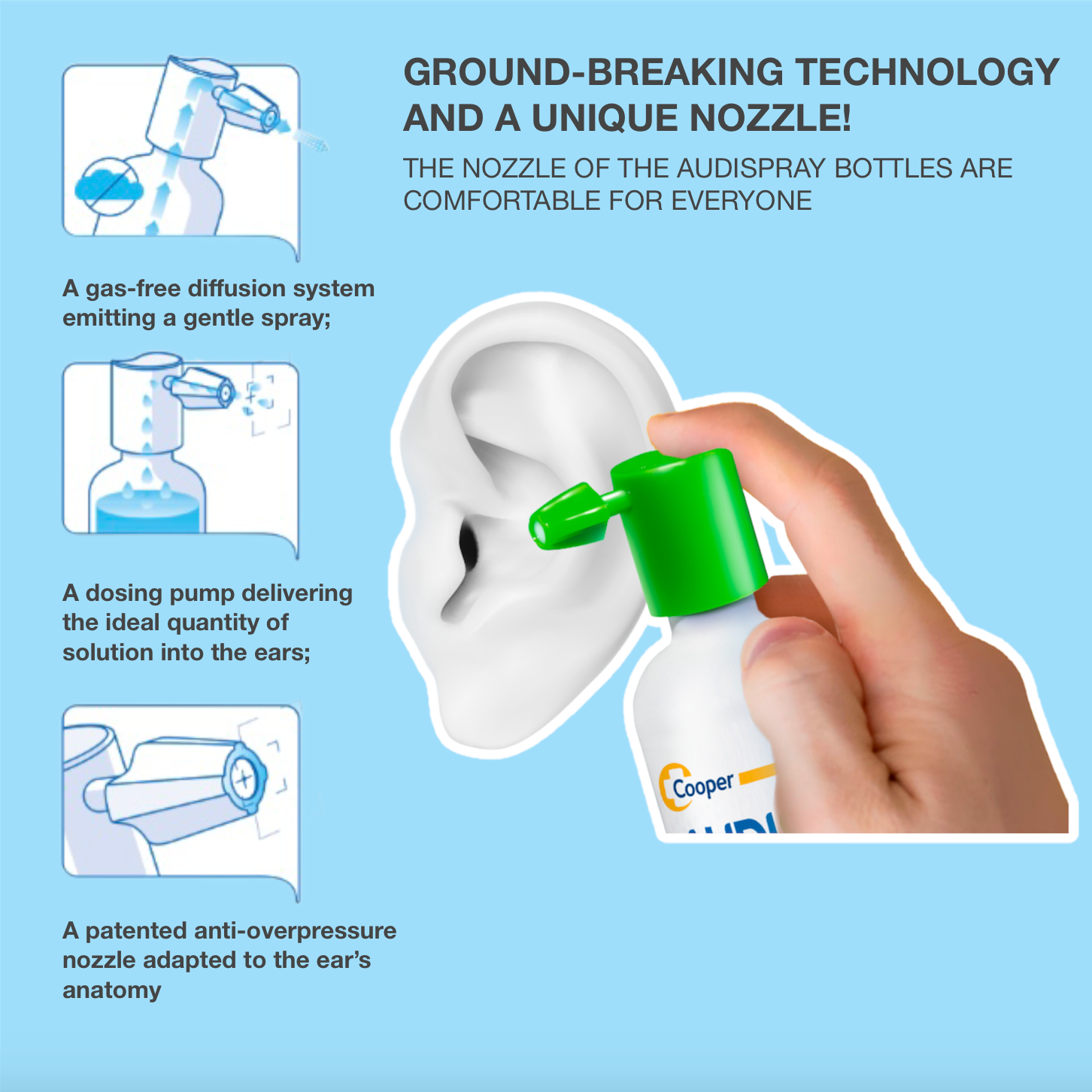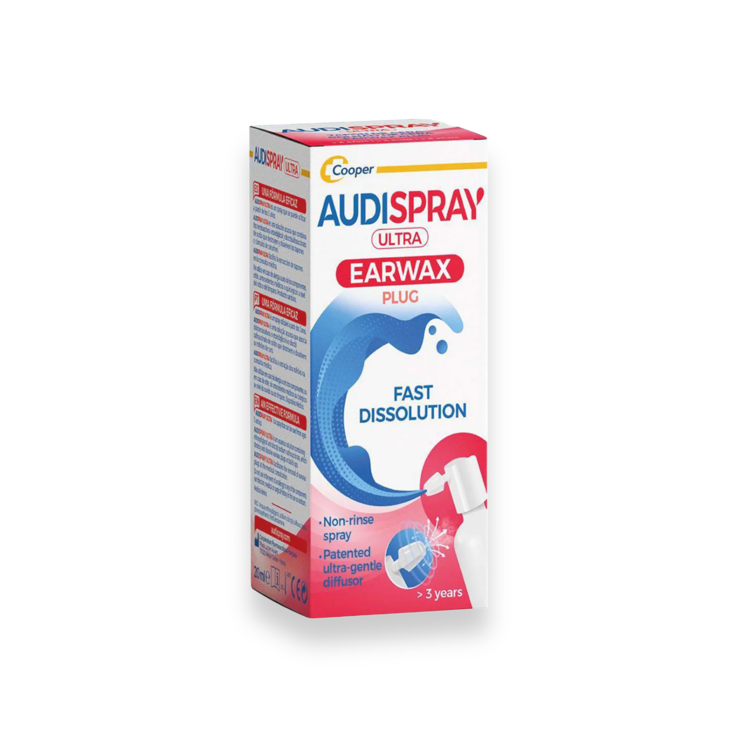 Audispray Ultra disintegrates and dissolves earwax plugs without rinsing with patented nozzle respecting the eardrum.