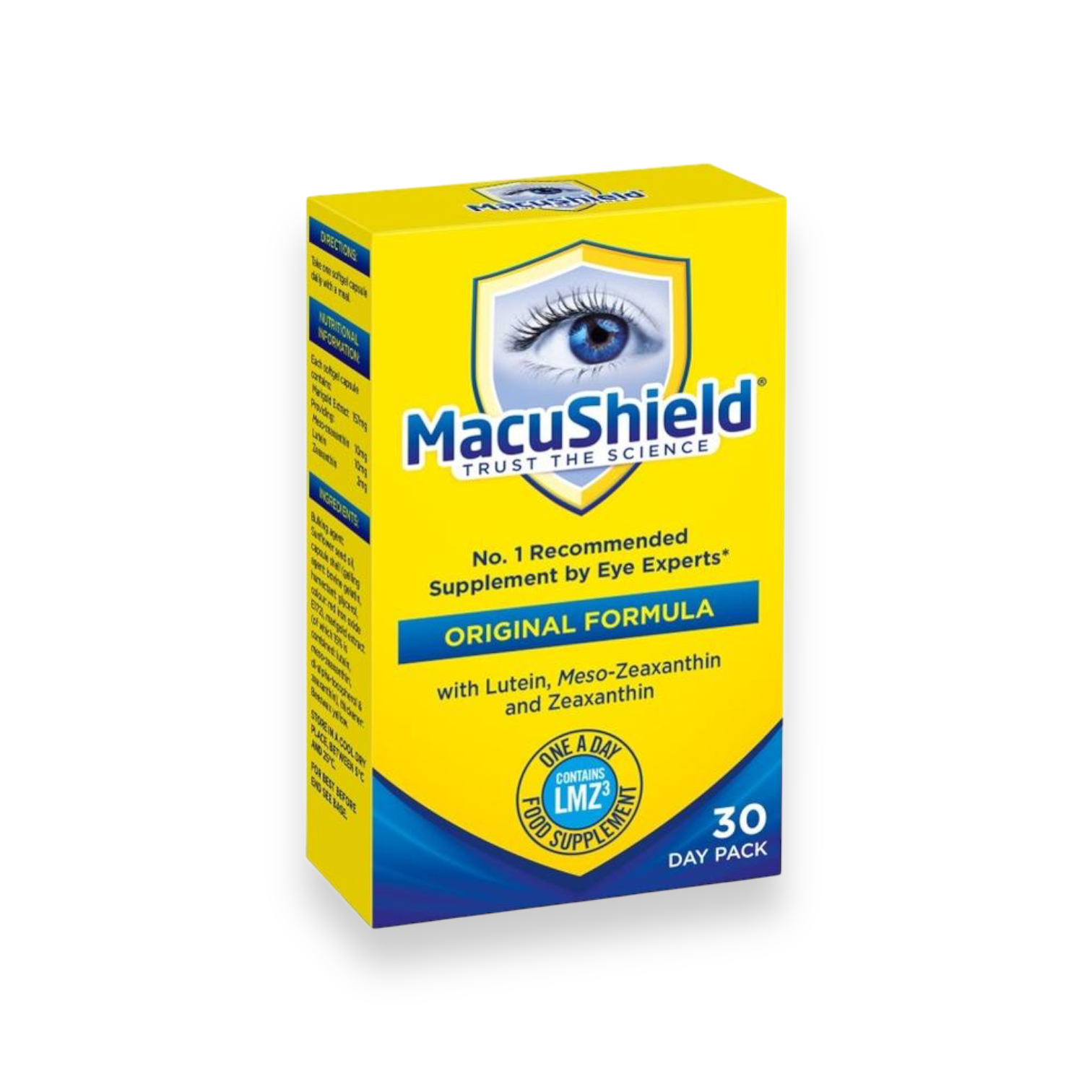 MacuShield® Original is a Lutein (10mg), Zeaxanthin (2mg) and Meso-zeaxanthin (10mg) one-a-day, easy to take, food supplement which combines all three macular carotenoids in a formula developed in collaboration with leading eye experts.
