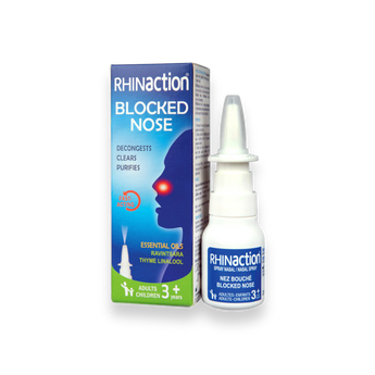 RHINACTION is a natural‑source nasal spray combining hypertonic seawater with essential oils (Ravintsara, Thyme Linalool, Field Mint) to relieve symptoms of blocked nose, nasal congestion and rhinorrhoea (runny nose) due to a cold or rhinitis.