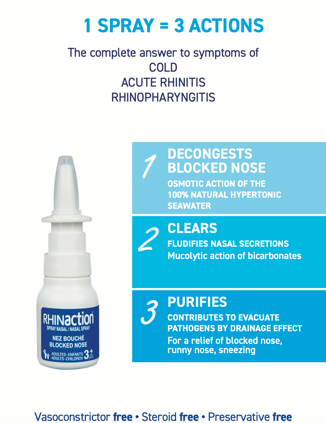 - Contra-indication: Do not use RHINACTION® during pregnancy or breastfeeding, by children under 3 years of age, if you are allergic to any of the components. Do not use the product in case of asthma.